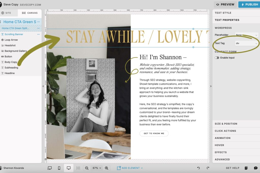 And because Showit gives you complete creative control, you can change the tag without changing how the text looks.